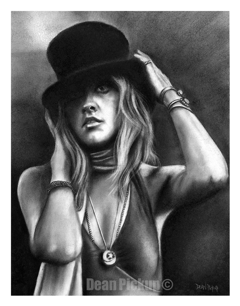 Stevie Nicks Print - 11"x14" by Dean Pickup. This print was originally drawn by hand using paper and charcoal and has been professionally printed for you on high quality, matte white acid-free card stock using archival ink.